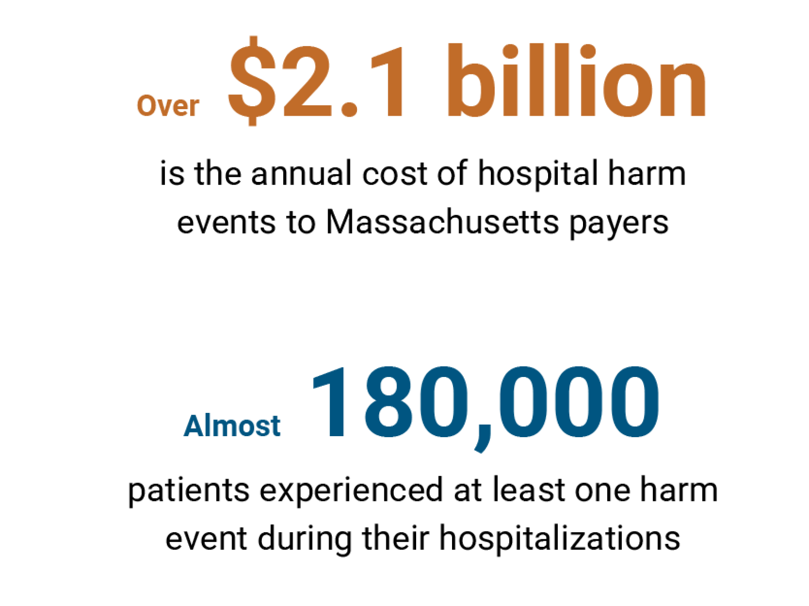 Patient harm happens in all health care settings. In hospitals, almost 1 in 4 patients will experience a harm event, costing Massachusetts payers an estimated $2.14 billion annually. These figures do not include costs to patients and families and to the hospitals themselves. Nor do they capture how harm events impact patient and workforce well-being and strain system capacity.