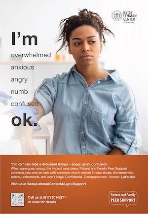 Do you work in risk management or patient relations for a health care institution? Maybe you are a social worker, or you run a community organization that is looking for resources for its members. The Patient and Family Peer Support Network is free for all residents in Massachusetts. Please help us promote it with the materials below. Contact us at Peer.Support@BetsyLehmanCenterMA.gov to request printed copies or if you have any questions about the network.