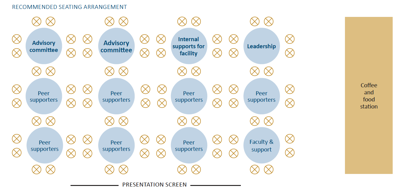 When possible during in-person training sessions, avoid seating supervisors at the same table as their staff. This will help encourage honest and open conversations. View example seating arrangement
