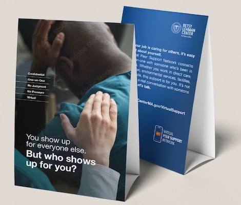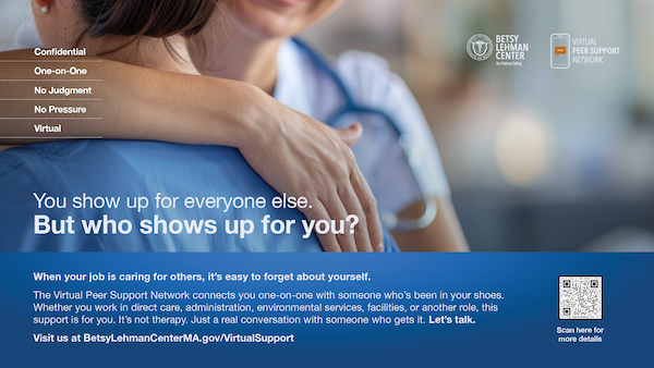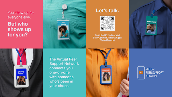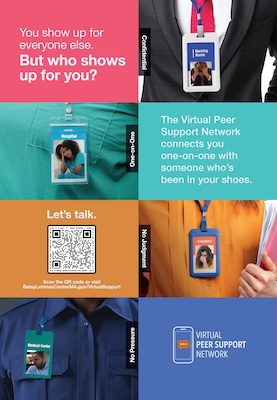 Health care organizations and individuals are welcome to use the materials below to help promote the Virtual Peer Support Network. We also offer co-branding for institutions who would like to offer the network as a resource to their staff and work with us to spread the word within their organizations. For more information or to request printed materials, please email Peer.Support@BetsyLehmanCenterMA.gov.